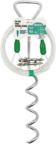 16" spiral stake and a standard 15 ft cable for dogs up to 60 lbs.
