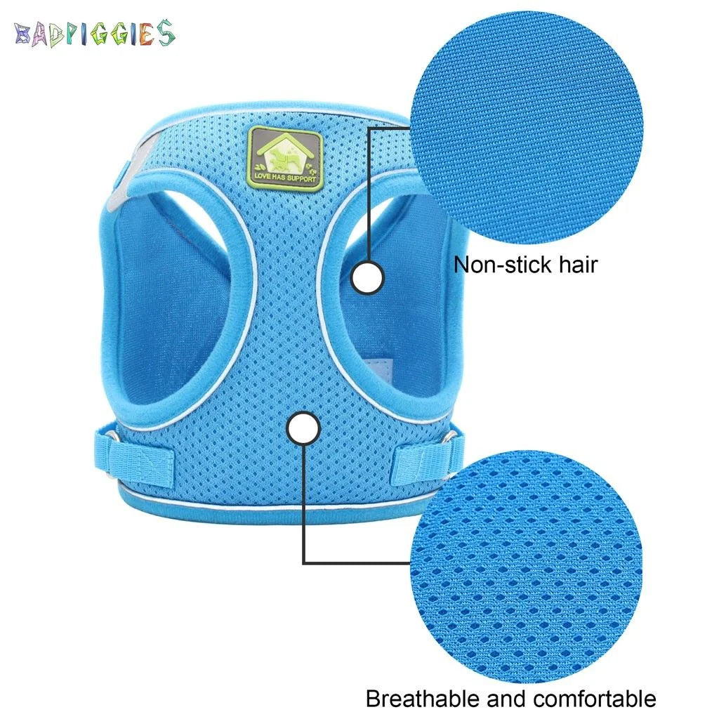 Reflective and adjustable. The reflective areas on the harness are a nice touch for evening walks. It's a lot easier...