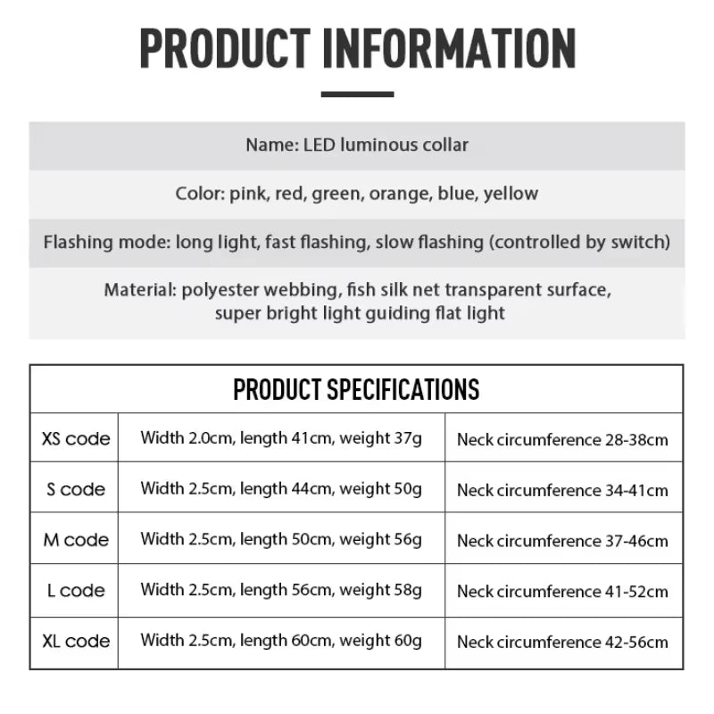 Product name: 2.5 silk light-emitting collar Material :polyester webbing, fish light-transmitting surface, light guide flat fiber (length can freely cut) Color: red, blue, yellow, green, orange, white, pink. Flashing : long bright. Fast flashing. Slow flashing (controlled by switch) battery life: 30-40 hours , about 2 months of normal use; Features: cleaning removable electronic parts; the product suitable dark environments or night walking dogs, outdoor and pet sports, through the fiber optic light, play a warning role, day or night, open and close the light can used pets